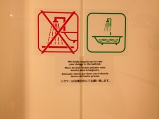 Voor veel hotels is afschot een onbekend begrip. Onhandig staand of zittend douchen in bad is ook waardeloos. Gevolg wateroverlast en een kletsnatte badkamer. Voor hoteleigenaren is het ook niet gemakkelijk blijkt uit onderstaande mededeling die ik vond in het Novotel in Amsterdam. Het blijft behelpen.