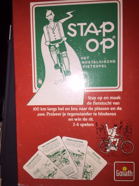Vroeger op Ameland speelde ik het al: Stap Op. Vond het toen leuk, maar ook gedateerd. Nu heet dat nostalgisch. Het fietsspel stamt uit 1940 las ik bij Wikipedia. Het is geïnspireerd op het Franse spel Mille bornes (1000 km via de RN 7).