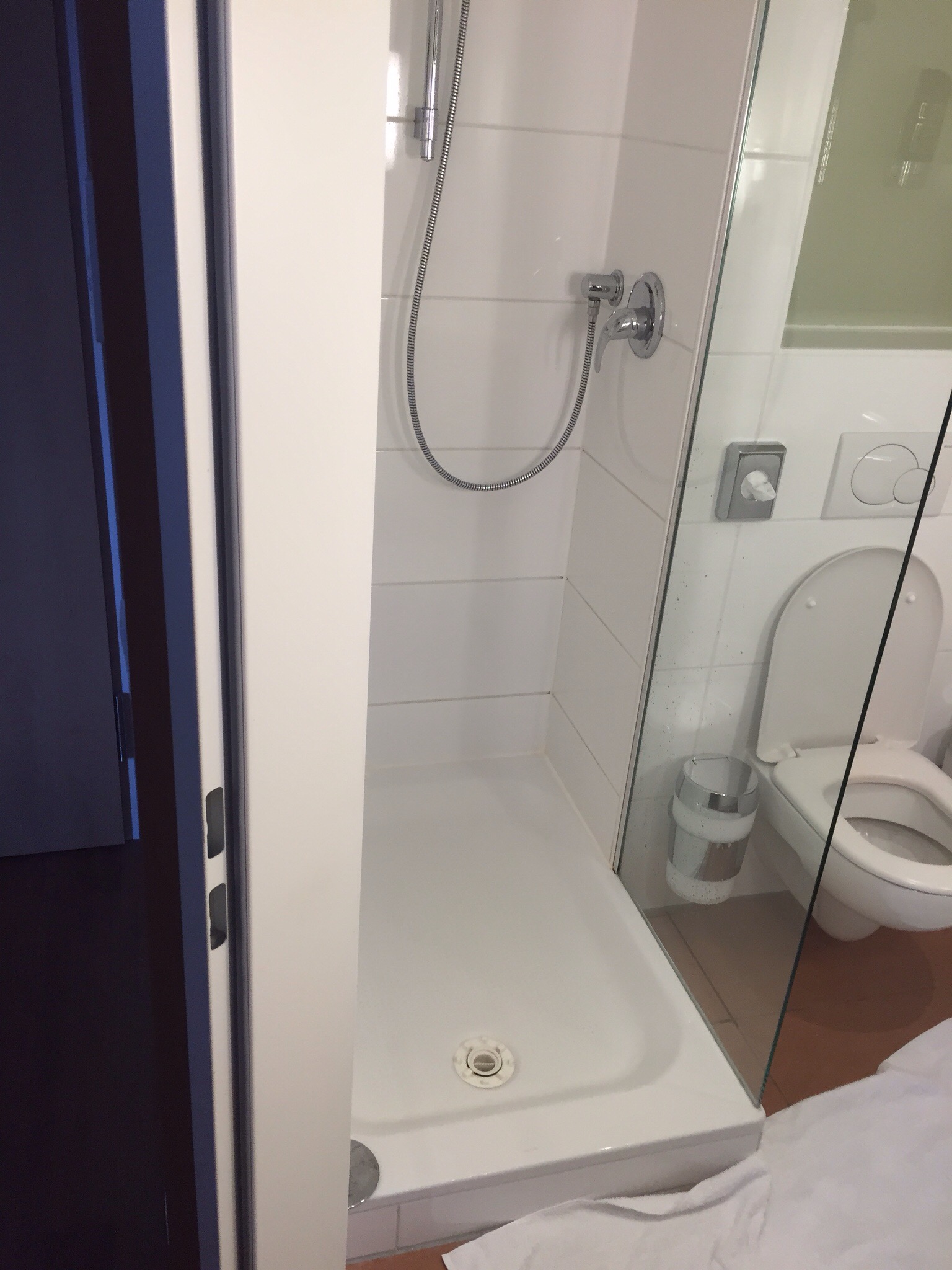 Vaak geen gelukkige combinatie. Dat heb ik in de loop der jaren ondervonden. Douchegordijnen zijn te kort en vettig of ontbreken. Douchecabines zijn in de regel ruim water doorlatend. Ook ontbreekt soms de ‘deur’ zoals bij Ibis in München (zie foto).